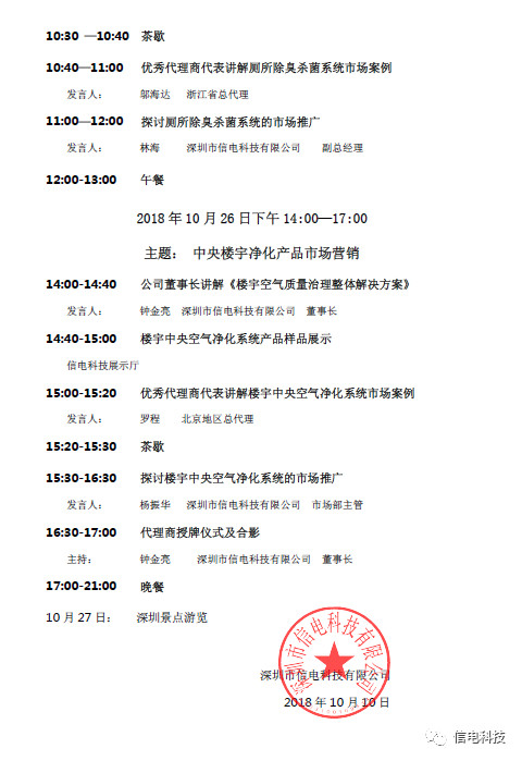 10月(yuè)26日(rì)上(shàng)午9點,伴随著(zhe)深圳信電☆€(diàn)科(kē)技(jì)董事(shì)長(cháng)鐘(zhōng↑&λ)博士的(de)歡迎辭,核心代理(lǐ)商會(huì)正式開(kāi)€&始。