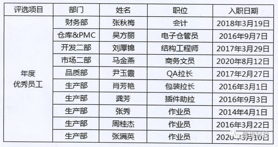 通(tōng)過公開(kāi)投票(piào),10名2021年(niá∏γ<n)年(nián)度信電(diàn)優秀員(yuán)工(gōng ✘§)出爐,他(tā)們分(fēn)别是(shì):