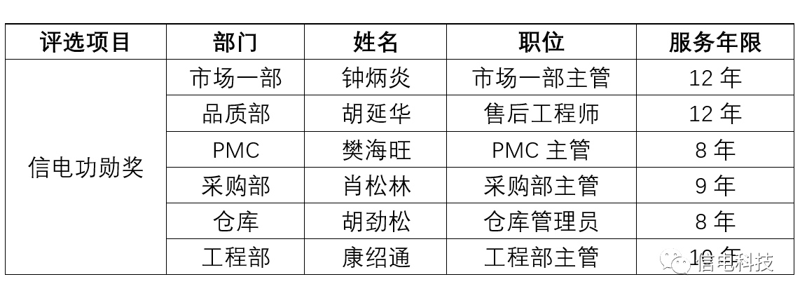 信電(diàn)功勳獎授于了(le)對(duì)公司發展作(zuò)出了(le)巨大"≤λ(dà)貢獻的(de)6名員(yuán)工(gōng),他(tā)們分Ω☆(fēn)别是(shì):